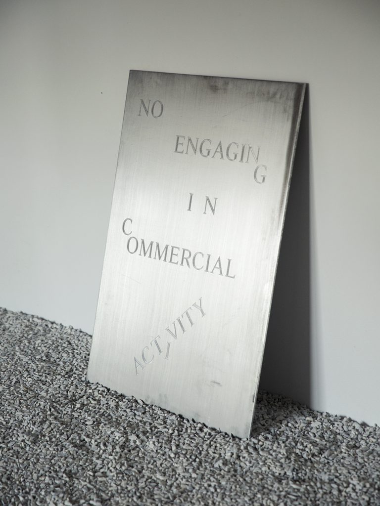 FC: The "NO ENGAGING IN COMMERCIAL ACTIVITY" etched metal slab really caught my eye, and it’s the only text-based work in the show. The type tilts and slips out of place in a manner that behaves [playfully] in concert with the rest of the work. Will you unpack this piece for us?
