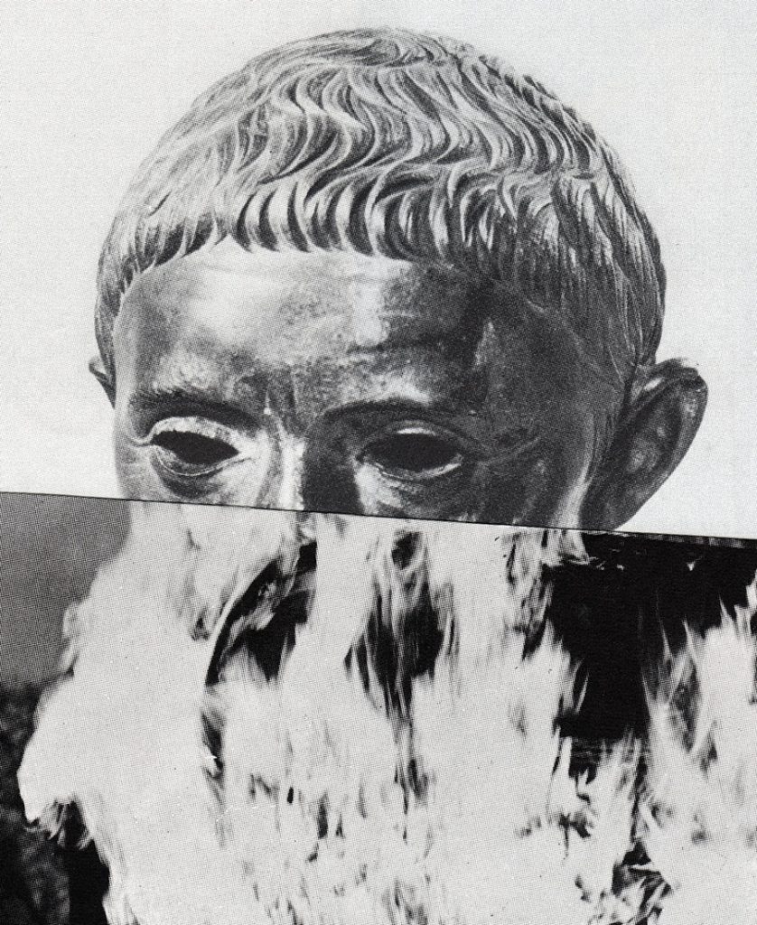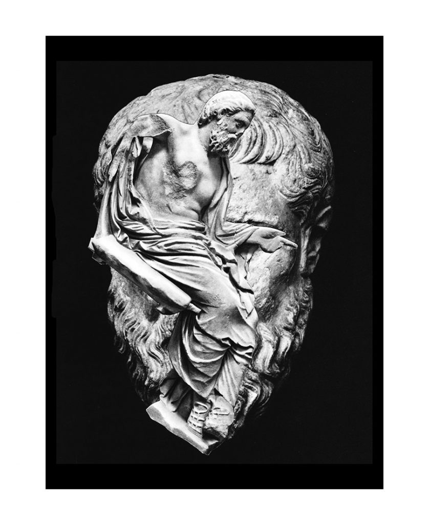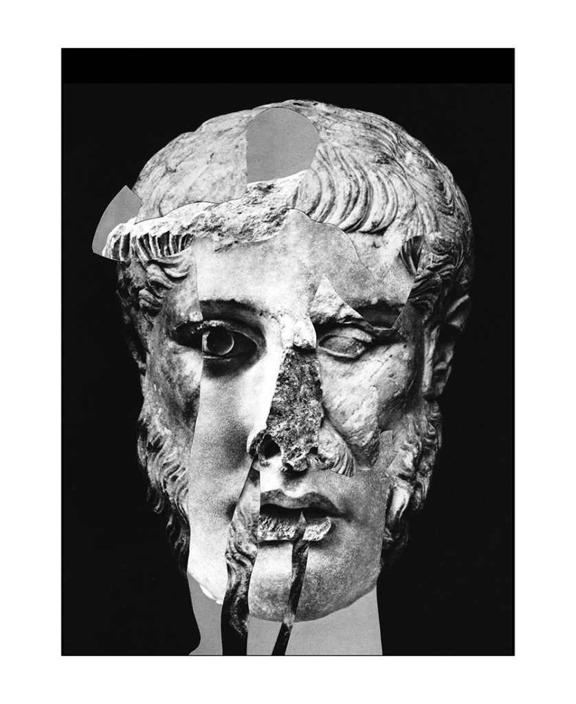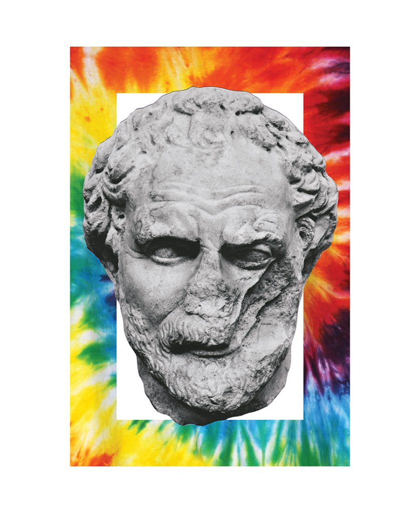 He is skilled with an almost uncanny ability to connect and modify fragments of what we are familiar with into something direct, deliberate, meaningful, and visually appealing. In response to an interview question posed about how and what major fragments play a role in his art, he responds, "My work constantly references a bit of destruction and isolation. Things are always in disarray. As far as 'life fragments' are concerned, I think of it as trying to connect all of these pieces in a state of disorder that is the world." While searching for ways to address disdain of capitalism, freedom from oppression, the depletion of natural resources, and the pursuit of happiness, the well-loved Americana tie-dye motif, an undeniable symbol of defiance of corporate culture, is borrowed and mated with oversized two dimensional images of ancient statue heads. The manipulations of antiquity point to the seriousness of the state of our union, as the contradictory tie-die border embraces the desire for change. The goal is all about finding the solution.