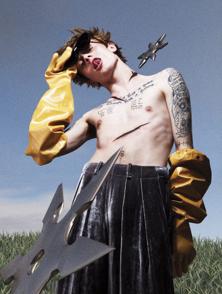 @ianwhatshisname wearing sunglass by HBA/Gentle Monster, pants by Pamplemousse, gloves are stylist own