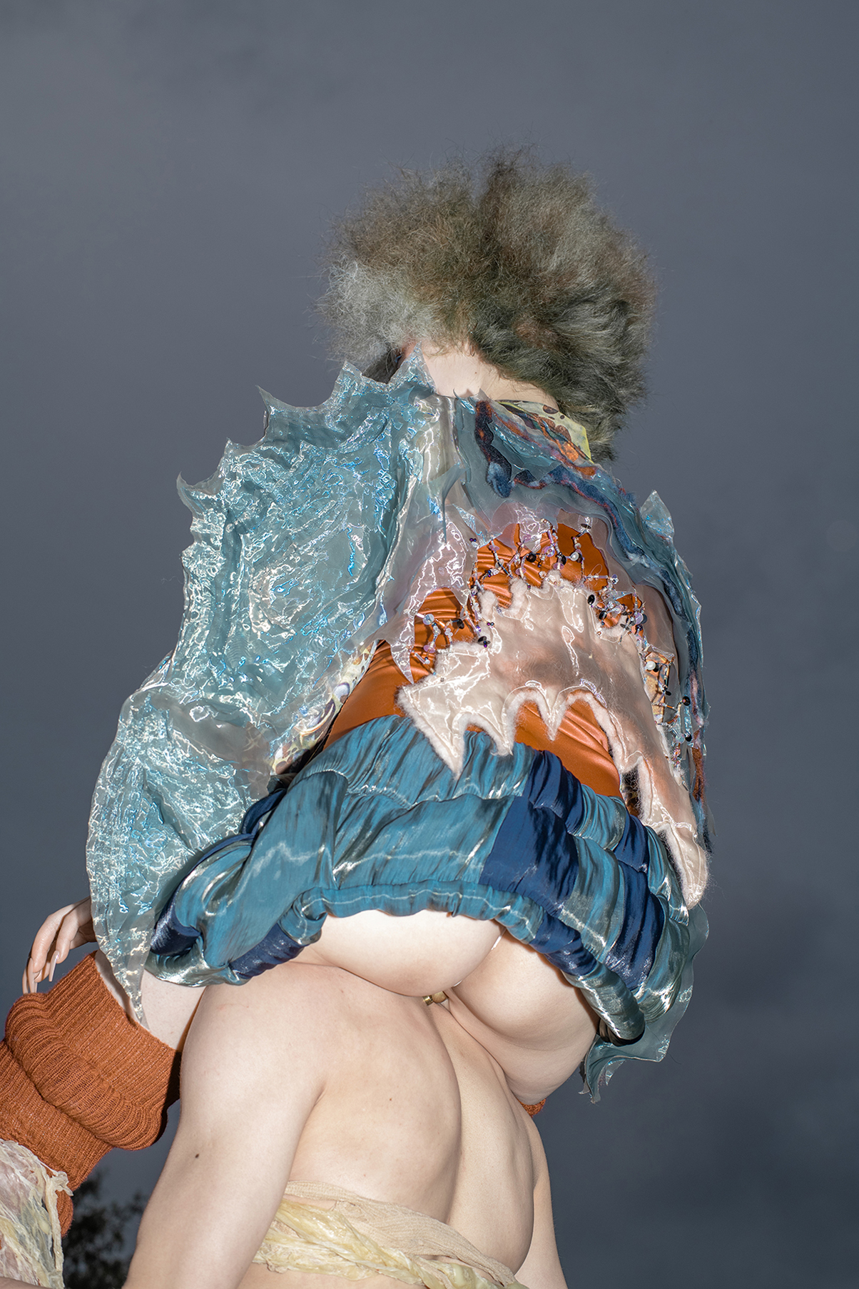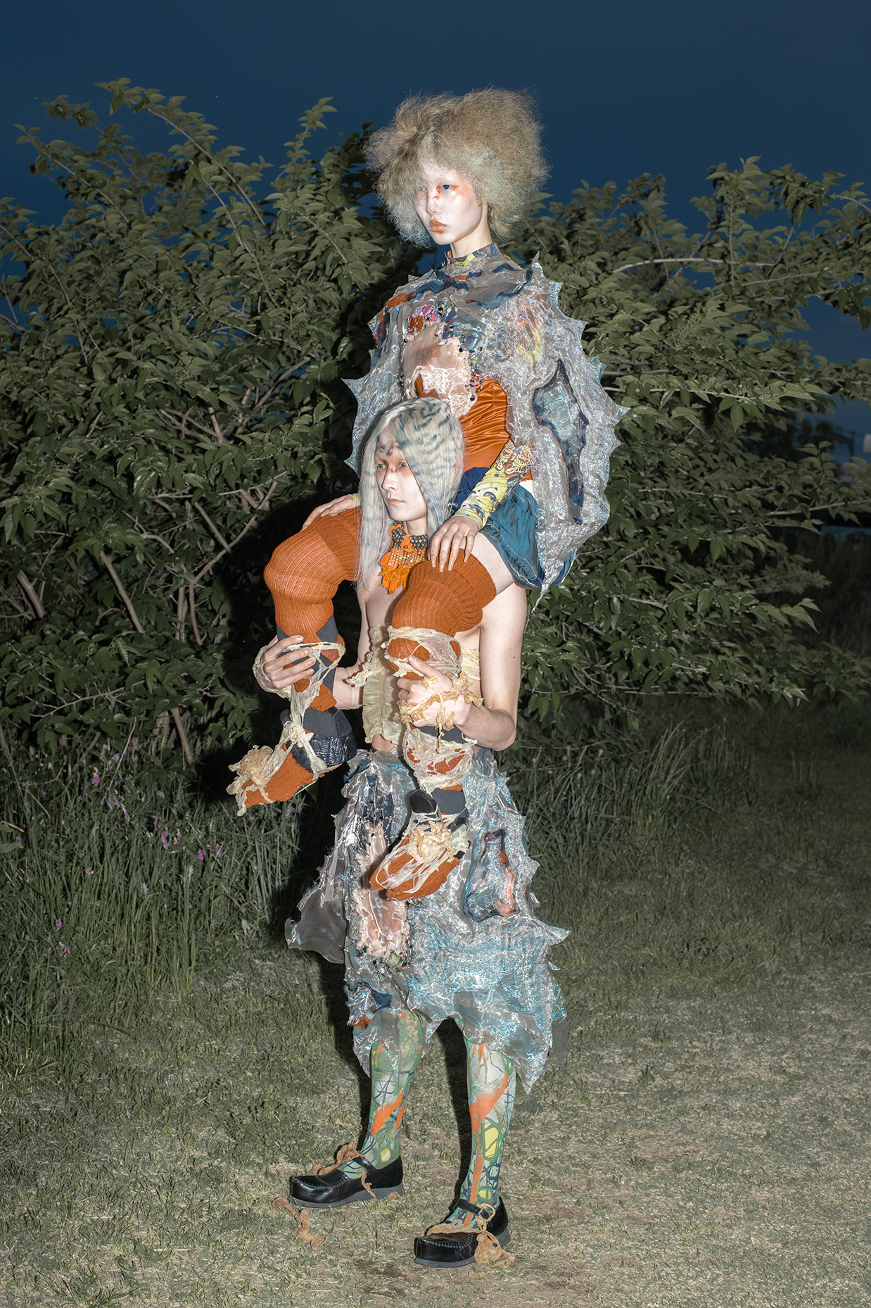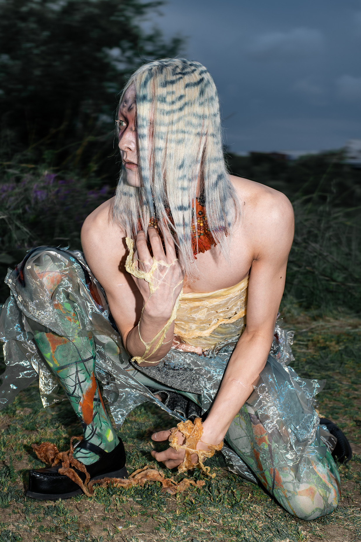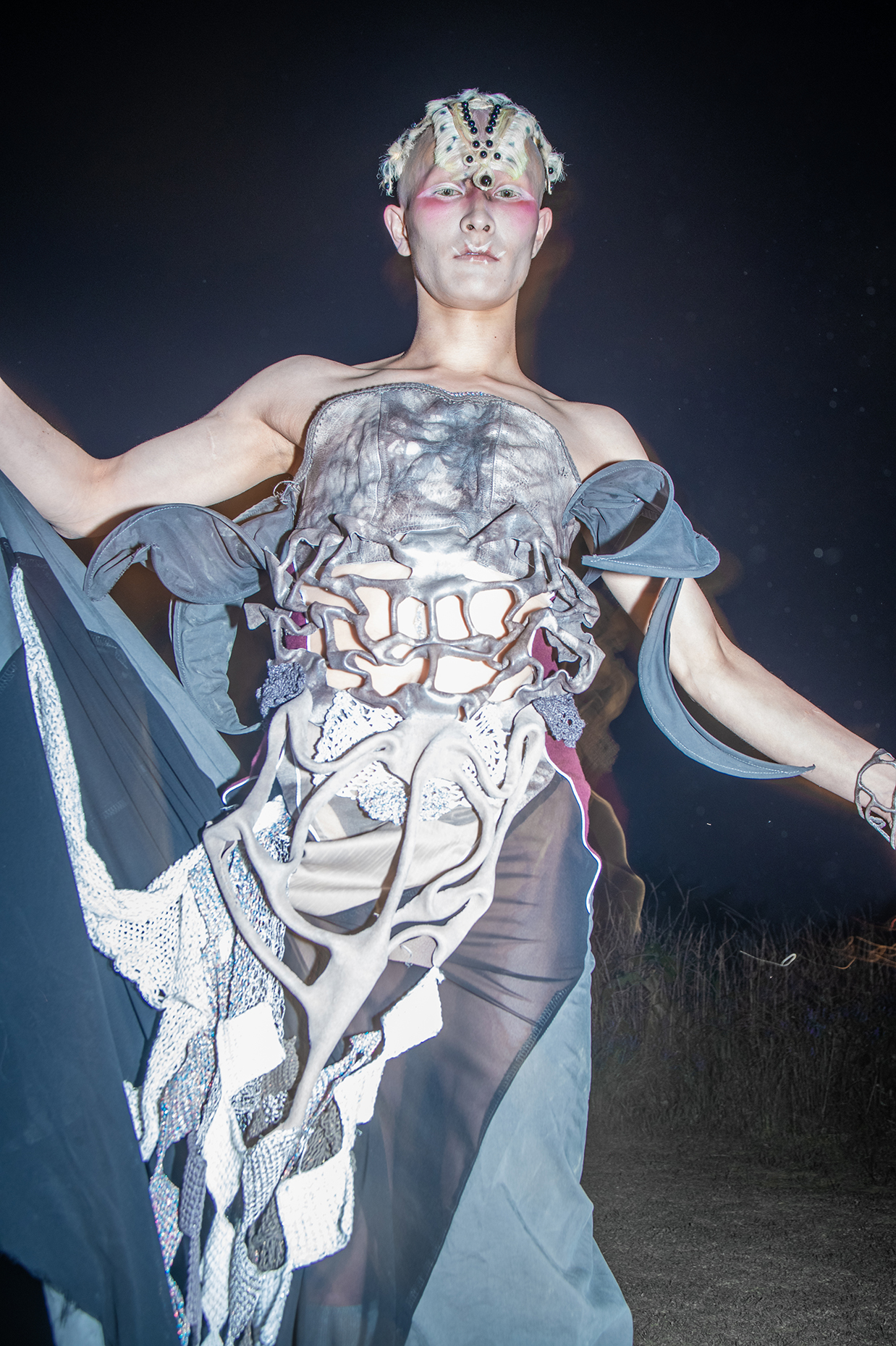 Artist Tomihiro's creature series, models were photographed in a performance inspired by the traditional Japanese art of dark dance, which presents an abstract visual expression of the process of gender bonding in post-humanist characters.
