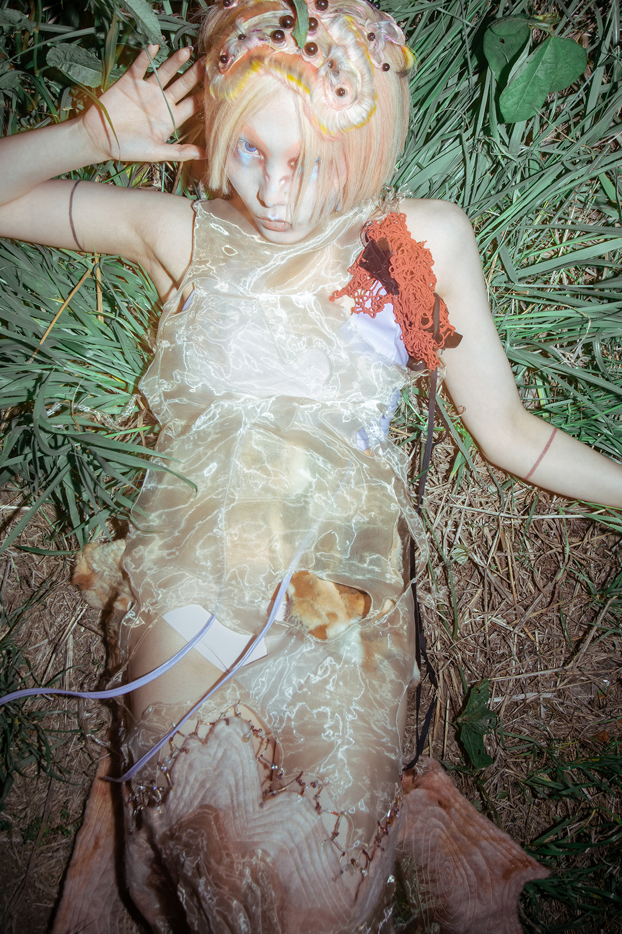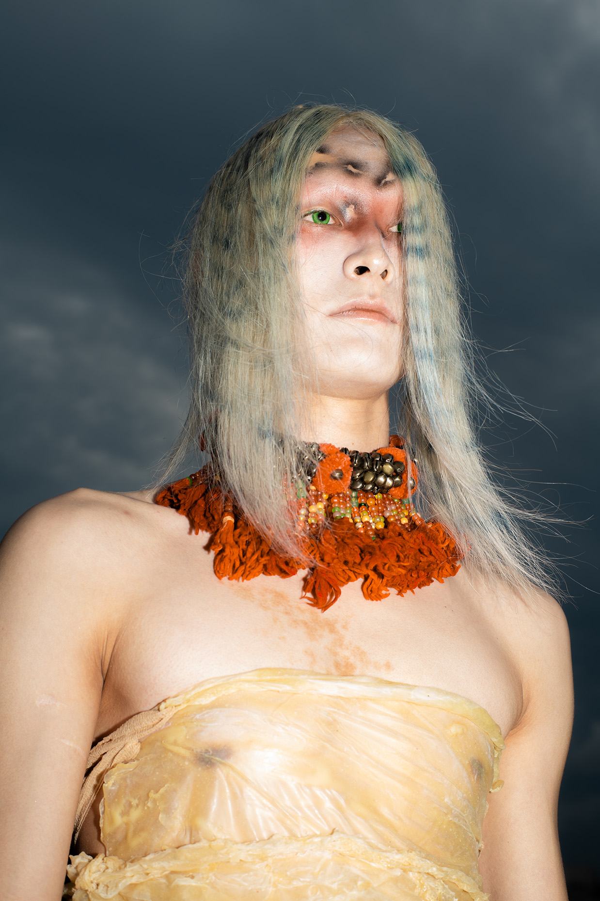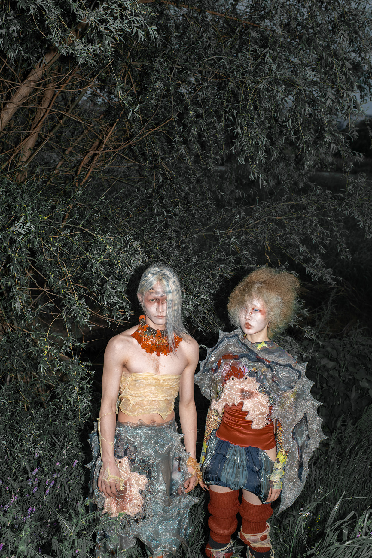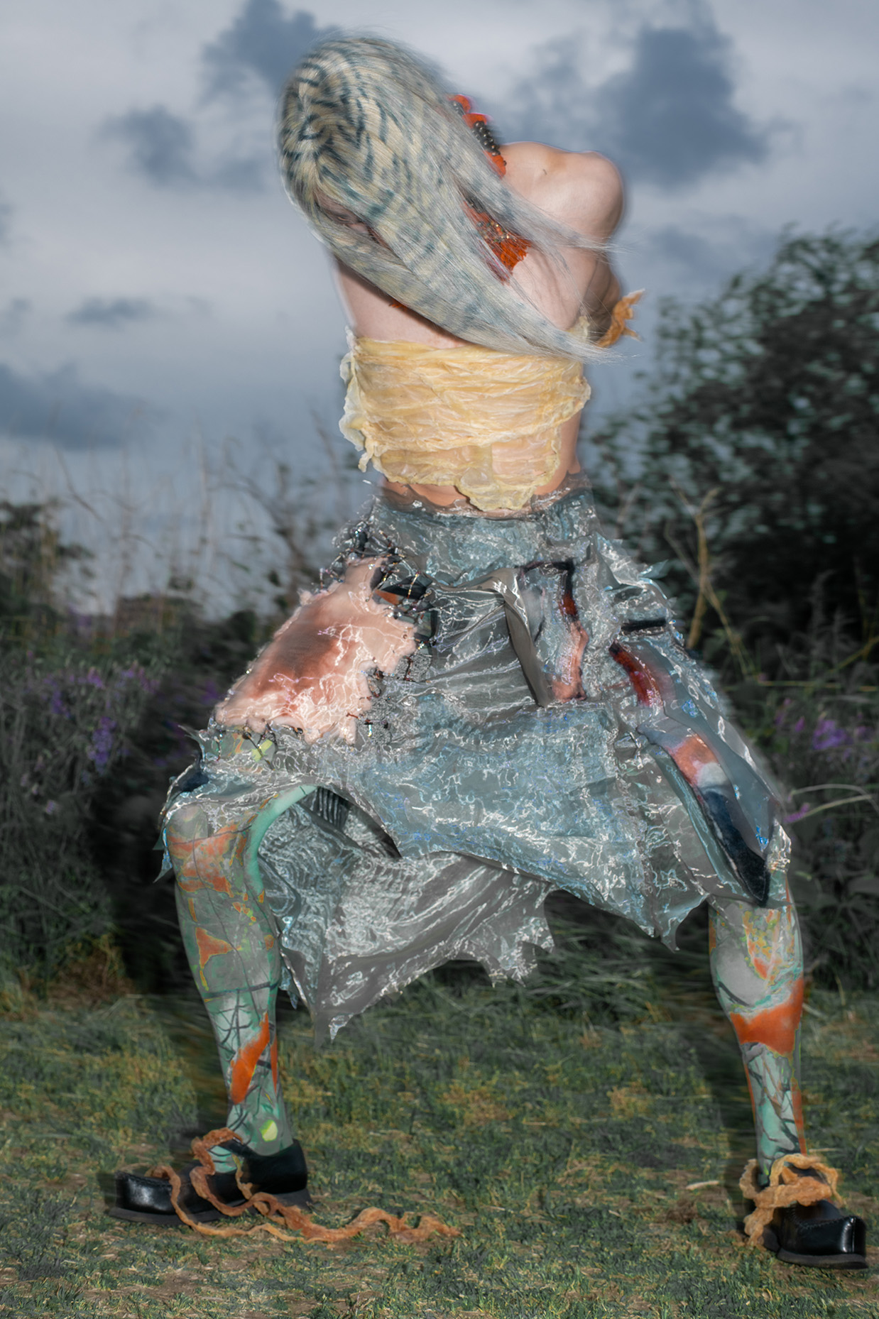 Artist Tomihiro's creature series, models were photographed in a performance inspired by the traditional Japanese art of dark dance, which presents an abstract visual expression of the process of gender bonding in post-humanist characters.